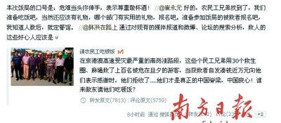大雨无情人有情,数日前,一些农民工兄弟在北京暴雨中救了上百名危在旦夕的游客。事件发生后,有网友在搜狐微博上发起了“请农民工吃顿饭”的活动(如右图,网络图片)。著名主持人崔永元获悉该信息后,表示将亲自请这些农民工吃顿饭。 崔永元微博宣布做东 前日,一位搜狐网友发布了一条动人的微博:“在京港澳高速受灾最严重的南岗洼路段,这些个民工兄弟用30个救生圈、麻绳救了上百名危在旦夕的游客,当获救者自发凑钱近万元向他们表示感谢时,他们拒收了!他们才是真正的中国脊梁,中国良心!谁来做东请他们吃顿饭?” 这条微博发出后,引来众多网友围观评论。网友们发起了“请农民工兄弟吃顿饭”,“哪位朋友愿意做东”的接力。“他们是最平凡的一群人,却是最伟大的一群人。”一位网友感动地表示,“150名民工雨夜光脚救人,来不及回去取钳子,十几个民工愣是把护网拽开了一个口子,他们自己的东西都被冲走了。” “我请!我打算响应搜狐微博的倡议,请他们吃顿饭,表示敬意!谁帮我找到他们,如有获救者和志愿者愿意加入,欢迎!”当天晚上,著名主持人崔永元在微博上响应了大家的“呼唤”,希望找到这些农民工并请他们吃饭,同时欢迎那些获救者加入。 “通过对现有的媒体报道和微博、论坛的搜索分析,救人的这些好心人应该是来自丰台河西再生水厂的150名普通工人!”随后,网友又开始进行接力搜索,并与“请农民工吃顿饭”公益活动负责人接力寻找这些农民工,最终确定了这些“伟大的平凡人”。 网友希望微博直播 “好的,农民工兄弟找到了,我们准备吃饭吧,本次饭局的口号是:危难当头你伸手,表示尊重敬杯酒!”昨日中午,在联系上救人的农民工之后,崔永元在自己微博上表示,150名农民工兄弟已经找到了,还应该有礼物。“哪个部门有实用的礼物,报名吧。准备参加饭局的被救者报名吧,我知道人数后,就定餐馆。” 这条微博又激发了众多名人和网友的参与。至昨日下午,崔永元在其微博上宣布:“好消息:著名歌唱家、慈善家韩红参加饭局,并且现场演唱,并且赠送农民工兄弟礼物!”这一消息引来网友追捧。“老崔办实事啊,支持老崔,支持老韩!希望更多的明星参与进来。”一位网友表示,不管你们喝什么(酒还是茶),第一杯是否献给灾难中逝去那些生命?另一位网友则表示无法参与现场敬酒实在遗憾,“希望看到微博直播。” 据了解,“请农民工吃顿饭”活动是由著名公益慈善人王振耀、孙立平、杨团在今年5月18日联合搜狐微博发起的大型社会沟通公益活动,两个多月来共举行了近二十场,引来了社会各界人士响应,包括陕西公安厅副厅长陈里、著名财经人士苏小和、媒体人士曹林、文化人士叶匡政在内的众多名人都参与到活动中来请农民工吃饭,不少人还现场帮助解决了一些人的就业、生活问题。 南方日报记者 蒋哲 @邱致君:农民工是中国建设的主力军,向他们致敬! @谢锐:想起来真难过,他们在北京没有房子、车子、户籍,他们的子女就读的打工子弟学校随时可能被取缔。他们连被城市抛弃的机会都没有,因为城市尽管是他们建设的,却和他们一点关系都没有。 @卢洁:一个大家庭离不开互相帮助,吃饭大可不必,只是那些城里人别再冷眼对待农民工就行了。 @公子小白:危难之时,农民工至高无尚的精神值得我们尊敬。那些自认为比农民工高尚的人呢,你们在干吗? @樱桃木木:我们感谢农民工兄弟!不仅仅是请他们吃饭,而是从心底改变对他们的态度,尊重他们,为他们解决更现实的问题,比如,子女上学、就医等。 @紫水晶:本来就是一家亲,多请几顿饭,人情味儿就浓了,社会自然就和谐了。 @沁园听雪行走在路上:我能说中国少了农民工,就是被抽掉脊椎的软体动物吗? |