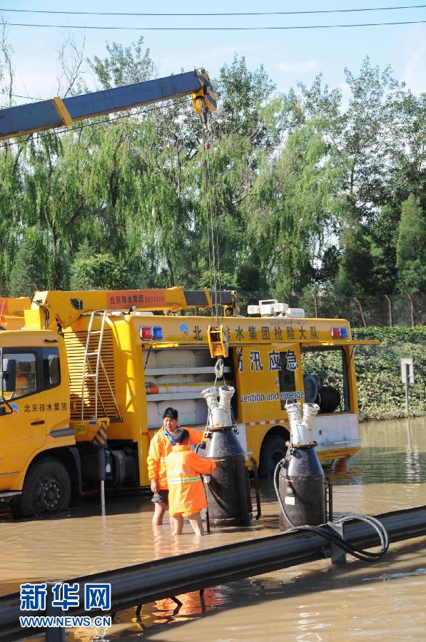 7月23日,在京港澳高速南岗洼路段,救援人员在水中安置排水设备。