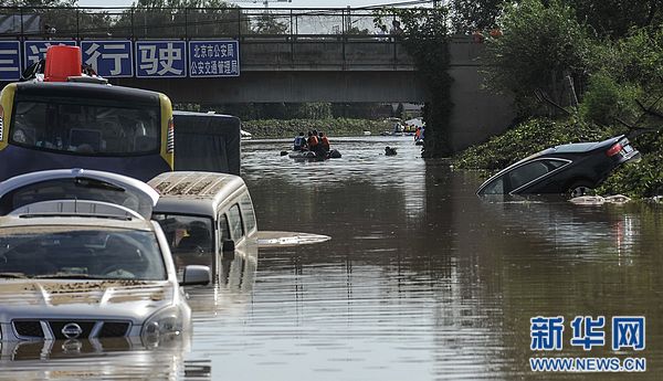 7月22日,搜救人员在淹没的车辆间搜索。记者从北京消防部门了解到,21日的强降水导致京港澳高速公路16公里处一铁路桥下严重积水,导致多台车辆被淹,22日上午已发现3名遇难者的遗体。由于积水量大,作业时间长,北京市交通部门预计23日京港澳高速仍然无法通行。 新华社记者 张宇 摄