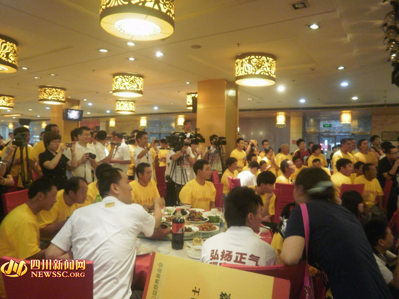 现场布置颇为隆重。饭店门前,一个巨大的条幅写着“向在北京7.21特大暴雨中参加救援的农民工兄弟致敬!”进入饭馆后,一个大屏幕还在不断播放媒体采访这些救人农民工的视频画面和照片。所有这些仪式,都是为了迎接那些在暴雨中不顾危险营救他人的农民工。