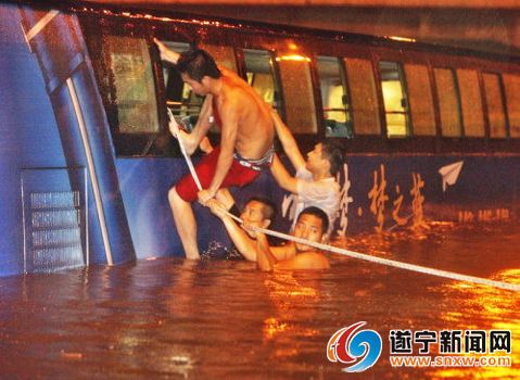 “跳进水里一个一个救人肯定不安全,身体撑不住。”工友们商量后,决定由人先把绳子一头固定在高速路边的电杆和大树上,而绳子另一头则由工友们带着气圈游到路中拴在大巴上。当晚,在十多米宽的高速路上,这些壮实的农民工汉子,借着长绳跳入水中,用连抱带拽的方式,硬是将被困者转到了岸边。那些不能下水的农民工家属则在岸边接住被困者,将他们安置到工棚里休息。整个救援行动从当晚9点一直持续到凌晨3点。