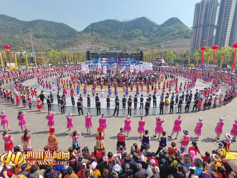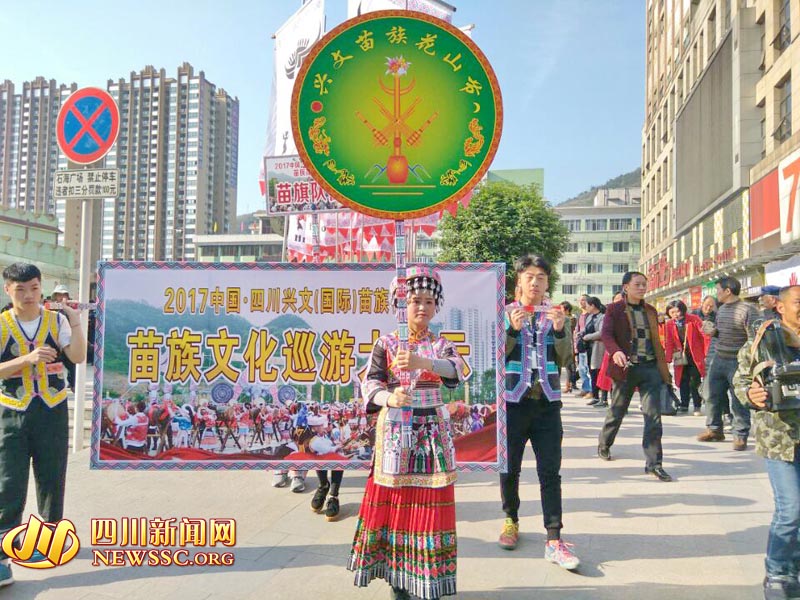 “花山节”现场 四川新闻网宜宾4月2日讯(胡先映 申勇 记者 周瑜原 摄影报道)4月1日,2017中国·四川兴文(国际)苗族花山节在宜宾兴文县光明新城市民广场开幕,来自川、滇、黔、湘、渝的数千名苗族同胞以及游客齐聚兴文,载歌载舞,共度节日。 “花山节”是苗族民间一个盛大的传统节日,又称“踩花山”、“耍花山”,既是苗族祈求人丁兴旺、风调雨顺和互相祝福的一个盛大集会,也是苗族青年男女寻找知音的苗家“情人节”。 本次活动节以“苗乡情人节·相约在兴文”为主题,各地苗家儿女身着绚丽多彩的苗族服装,头戴银冠,发插银梳,伴随着欢快的鼓点、悠扬的芦笙调、悦耳的银饰脆响,组成31个方阵,沿“石海广场—甘洞湾溶洞公园—苗家新寨—光明新城市民广场”进行苗族盛装巡游展演,浩浩荡荡的队伍穿城而过,展示苗族别具一格的服装文化,引得游客们纷纷掏出相机、手机,追着巡游队伍拍个不停。