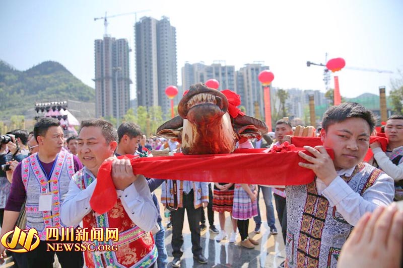 特色表演 本次活动还举行了苗族盛装巡游大展示和祭花杆仪式,按照苗家传统习俗,“祭花杆”是花山节必不可少的仪式。苗族德高望重的6位长老对装束好的多彩花杆杀鸡、燃香、点烛、敬献米酒、行苗家古礼,祈求花杆保佑人间风调雨顺,人们幸福安康、人兴财旺。配合欢快的芦笙调,苗族祭祀师唱祭花杆歌、跳祭祀舞。祭花杆仪式结束后,千人同跳苗族广场舞《吼当》也成为了当天的一大亮点,欢快的音乐、轻盈的舞姿,让不少游客情不自禁地参与其中。《吼当》是兴文打造的一首具有川南苗族特色的敬酒歌,苗语译为“干杯”。当日中午还举行了兴文著名的苗族长桌宴。
