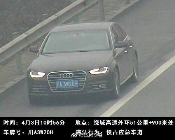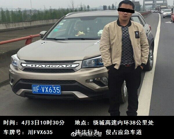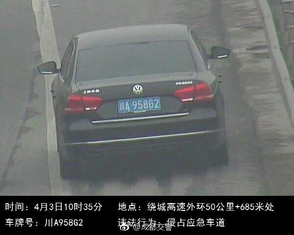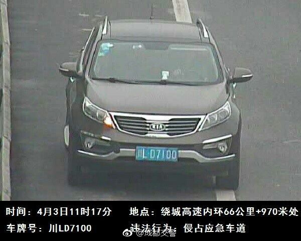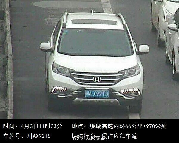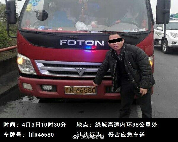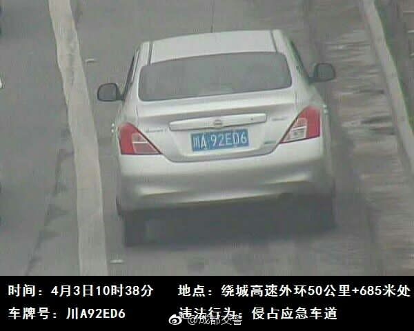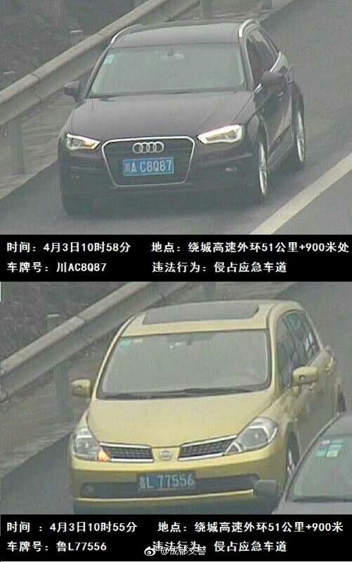 成都交警提醒,清明小长假期间,成都交警严查侵走应急车道交通违法,同时通过官方微博、门户网站对部分侵占应急车道的违法车辆进行曝光。成都交警特别提示:应急车道严禁侵占!侵走应急车道的将一律受到电子眼抓拍、民警现场处罚。(图由成都交警提供)