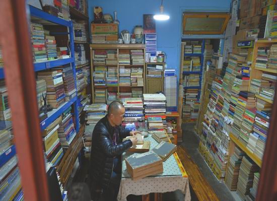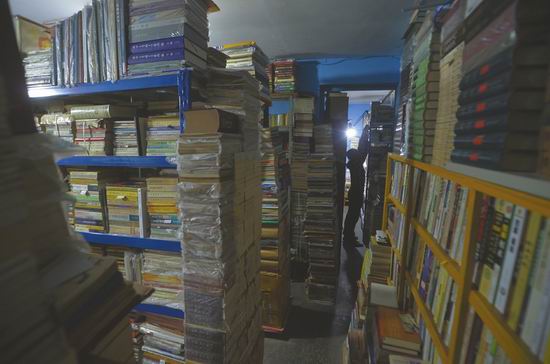 一百平方米的房间里堆放了约8万册旧书,稍微胖点的人在书墙形成的狭窄通道里转身都显得有些困难。