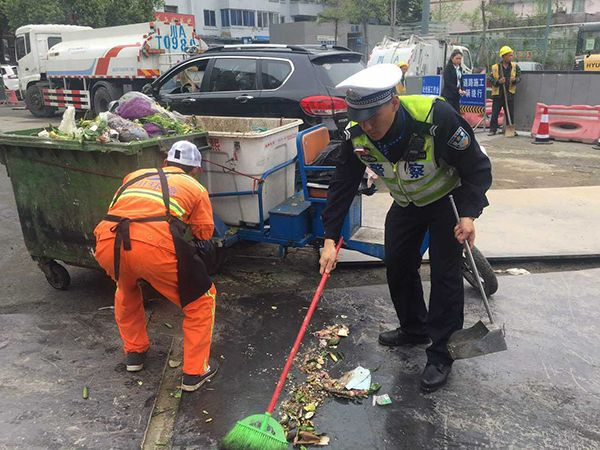 龙林说,环卫车侧翻后,一位50岁左右的环卫工,在费力地扶正车身后,开始准备打扫垃圾。见此情景,龙林便二话不说,就拿起一旁的扫帚,开始快速清扫起来。5分钟左右,地面垃圾被清理干净,路口交通也被疏通。龙林又继续工作,压根没想到这一幕,竟会被人拍下来发到网上,然后悄然走红。“下午同事在说,我才晓得这事的。”说到这儿,龙林有些害羞,“一开始我就是想搭把手,快点帮他清理完垃圾,以免造成交通的拥堵。”(图由成都交警三分局提供) |