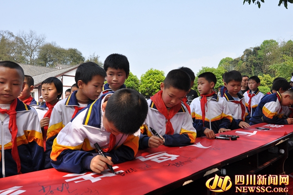 四川新闻网宜宾4月7日讯(袁洪 记者 周瑜原 摄影报道)今日,宜宾市2017年“爱鸟周”活动启动仪式在江安县夕佳山镇举行。此次活动以“依法保护候鸟、守护绿色家园”为主题,启动仪式上诵读了《爱鸟护鸟倡议书》,随后现场数百名代表在“关注候鸟保护 守护绿色家园”横幅上签名,以此倡议大家共同爱鸟护鸟。
