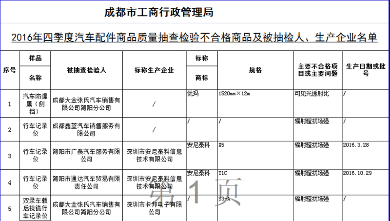 成都11批次汽车配件被查不合格 10批次为行车记录仪