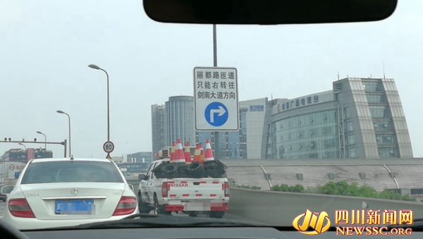 二环路丽都路口上行匝沿途,交警设有路线指示牌,用以提醒市民只能右转出城。