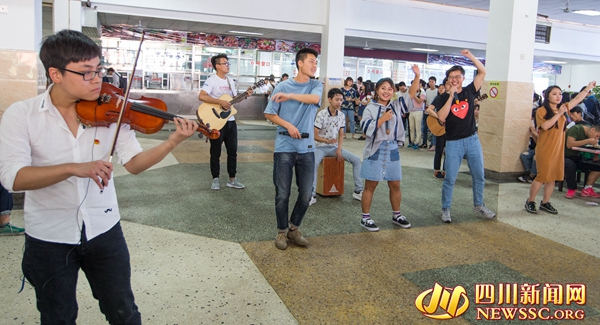 中午时分,涌入学校食堂的师生越来越多,由四川理工学院大学生艺术团组成的快闪队伍在短时间里井然排列。突然,动听的单簧管、黑管演奏响起,正在排队打饭的师生纷纷靠拢过来。在声乐、器乐合奏《彩虹》《找自己》《成都》歌曲响起之后,现场瞬间一片沸腾,正在食堂吃饭的很多学生被这热闹的气氛所感染,不约而同地放下筷子,也纷纷伴着欢快的节拍,打起节奏唱起歌来。