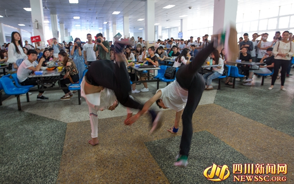 四川新闻网自贡5月2日讯 (记者 徐昭磊 摄影报道)今天中午12时许,在四川理工学院食堂内正逢学生用餐的高峰期,学生们打饭、就餐,一切都和平常一样。就在这时,一阵动感的音乐从人群中传来,该校艺术团的学生身着T恤迅速集结成队,在食堂的空地上玩起了“快闪”。据组织这次活动的四川理工学院团委负责人介绍,他们希望用这种新颖的艺术行为迎接五四青年节的到来。