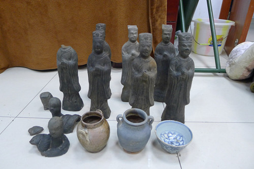 当天晚上,张某携带照明工具以及铁锹等工具悄悄在该处挖掘。果不其然,这是一处古墓,张某从该处挖出了8个陶俑和2个陶罐,带回家中藏匿。张某在家猫了十几天,看着没有风吹草动了就想把这些“宝贝”带到成都出手,大赚一笔,谁知还没上车就露了馅儿,被抓个正着。