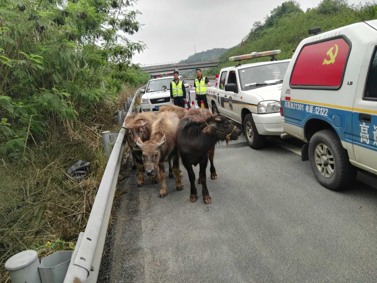 5月2号15时许,成南高速公路维二大队的几名队员巡逻至遂内高速公路24KM+600m处,发现5头正在高速公路超车道上悠闲行走的黄牛,严重影响了高速公路上来往车辆的正常通行,随时有发生危险的可能。