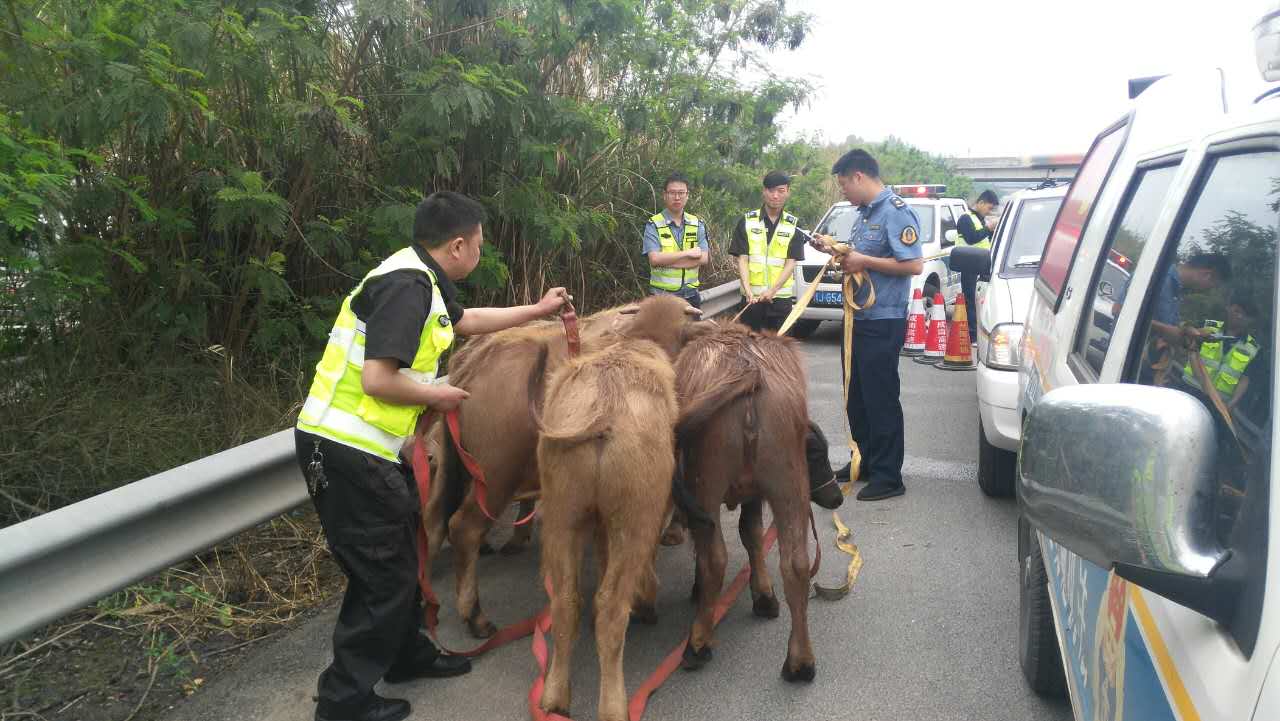 据成南高速路维二大队副大队长徐道利介绍,同事告知其此事后,他及时赶到事发路段。让一名同事驱车到这群黄牛前方,堵住黄牛逃窜的去路,另外几人从后方和侧面围堵黄牛,他们顺势将5头黄牛驱赶至应急车道。