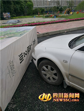 “当时因为在附近有事,就把车停在了这里。”杨先生说,昨晚9点钟左右,他将自己的一辆白色帕萨特轿车停在了成都高车三路69号前的一条断头路上,路的尽头摆有两个广告牌。今天早上7点过,他前来取车时,却发现车前的一个楼盘广告牌压在车上。随后,杨先生找到了广告牌所属的楼盘开发商。