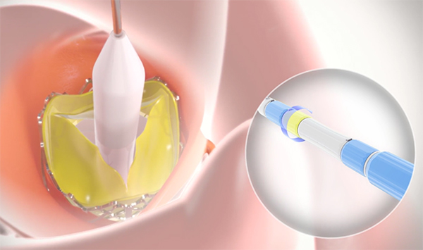 首款“中国造”心脏瓣膜有独特地定位装置,可以将瓣膜准确地放在需要安放的位置。(图中黄色物体为人工心脏瓣膜)