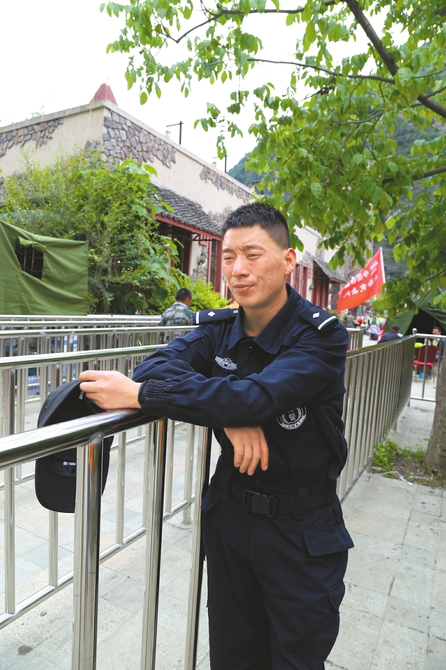 26日上午11点,茂县叠溪新磨村,阳光射在脸上有点火辣。树荫下的铁护栏旁,刚刚轮换下来的高猛,用帽子扇着风,一脸汗渍。