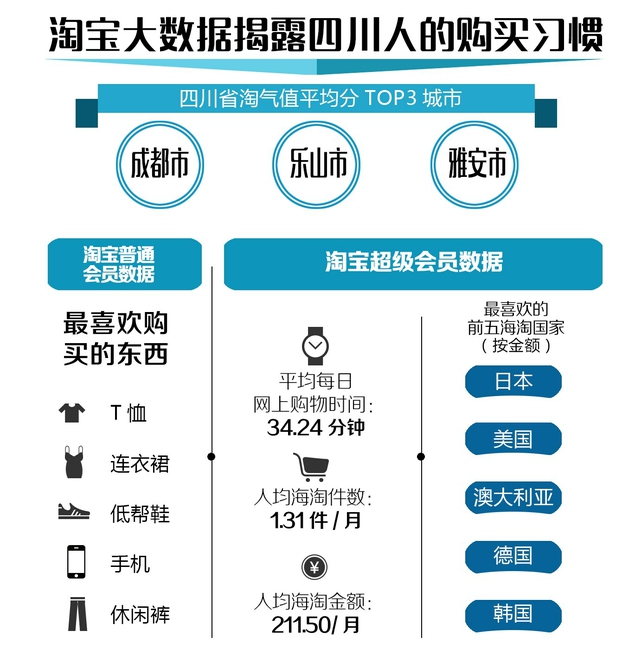 6月26日,阿里巴巴发布了《2017全国剁手党战斗力数据报告》。报告根据“淘气值”对全国各地的剁手党的消费力进行了排名。数据显示,上海、北京、天津、浙江、江苏位列全国前五。四川排名全国15位。成都的资深剁手党们每天逛淘宝时长为34.24分钟。