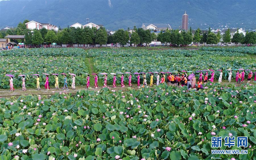 7月16日,旗袍爱好者在四川省绵竹市九龙镇新龙村荷塘参加旗袍走秀。盛夏时节,绵竹市九龙镇新龙村种植的荷花盛开,吸引旗袍爱好者前来游玩和走秀,荷塘的恬静之美与旗袍的优雅之韵相映成趣,成为一道独特的风景。新华社发(王平 摄)