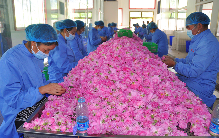 在清多香玫瑰花企业里,工人们正在择花,而冒水村贫困户周兴燕就是其中一个。