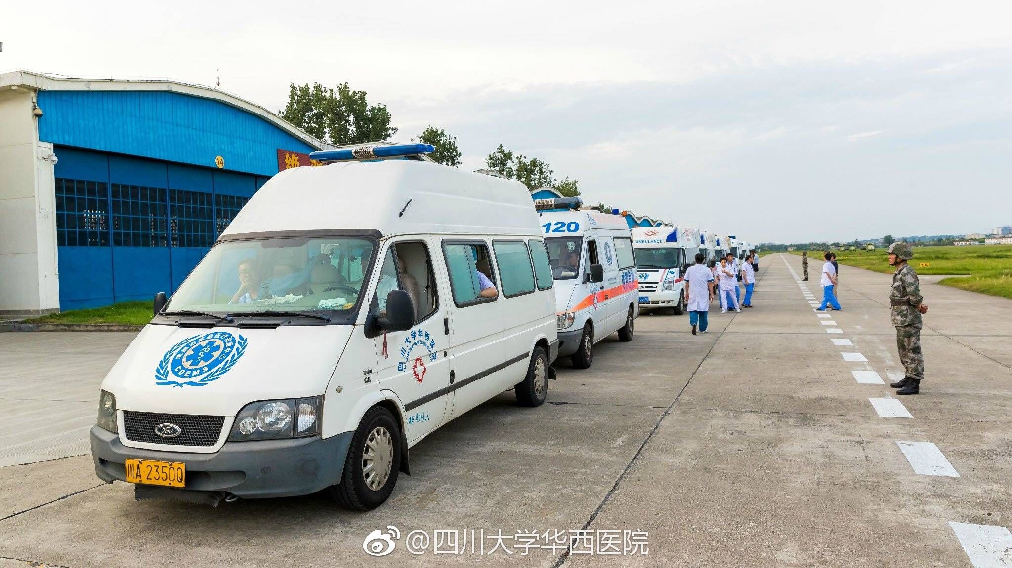 今日下午,川大华西医院救护车在凤凰机场等待地震伤员