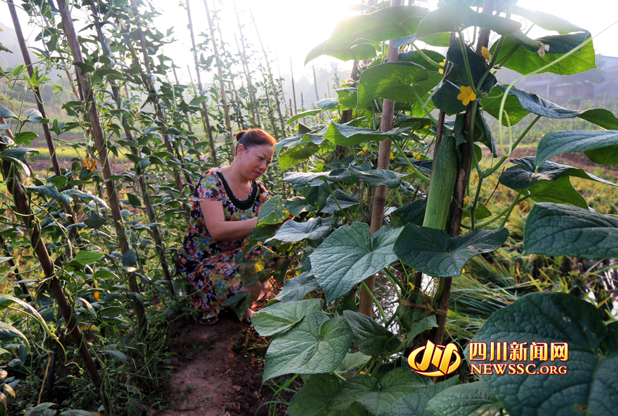 四川新闻网泸州8月20日讯(王琳 记者 岳东 摄影报道)日前,记者在泸州市江阳区邻玉街道漕溪村看到,一片片豇豆、黄瓜等绿色无公害秋季蔬菜长势良好,丰收在望。一组村民郭崇珍正忙于在菜地里管理绿油油的菜苗。