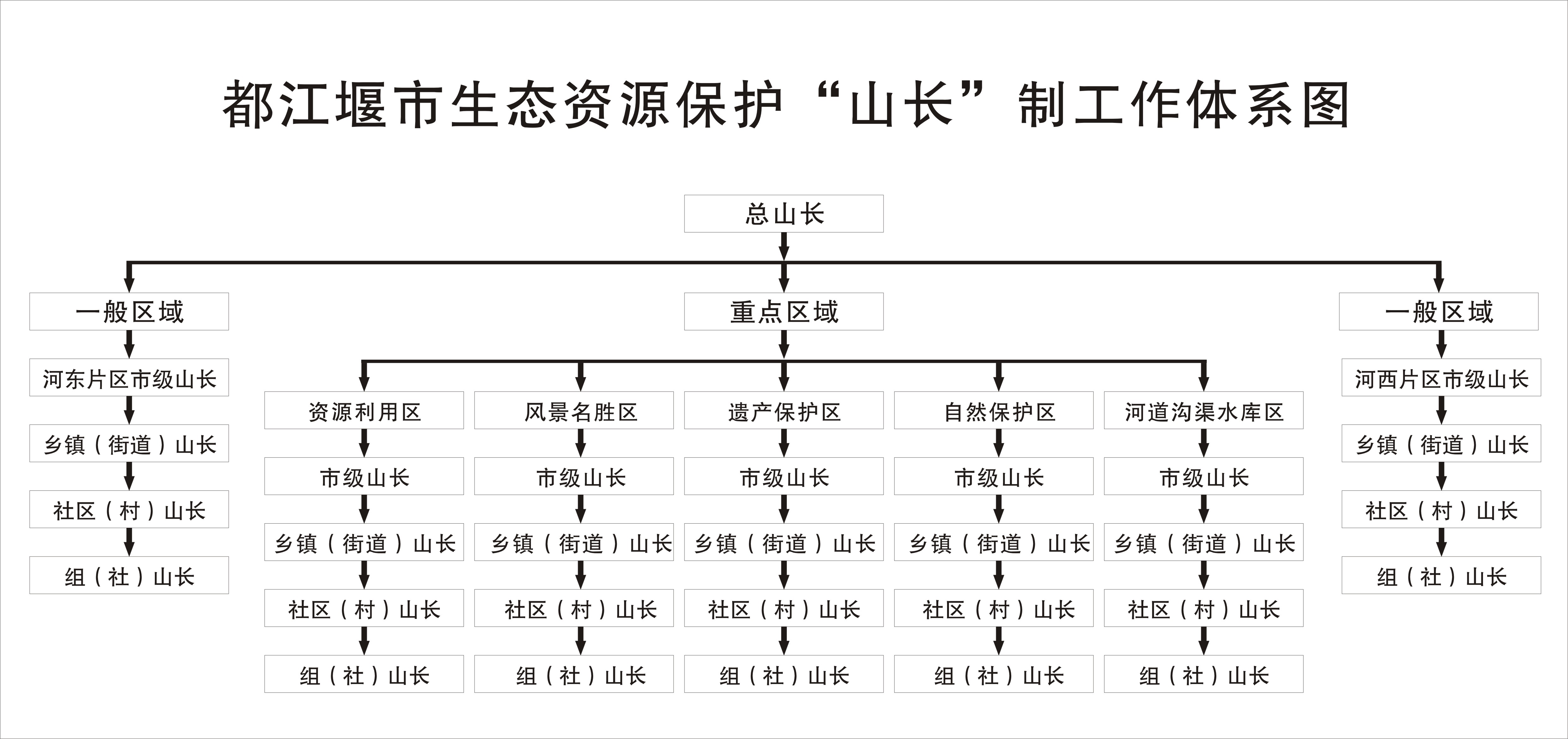 “总山长”“片区市级山长”由都江堰市委、市政府主要领导担任,负责全面领导部署行政区域内的“山长制”工作,担任总督导、总调度职责。乡镇(街道)“山长”由乡镇(街道)党委、政府主要领导担任。社区级“山长”由社区两委领导班子主要领导担任。组“山长”由组长担任。