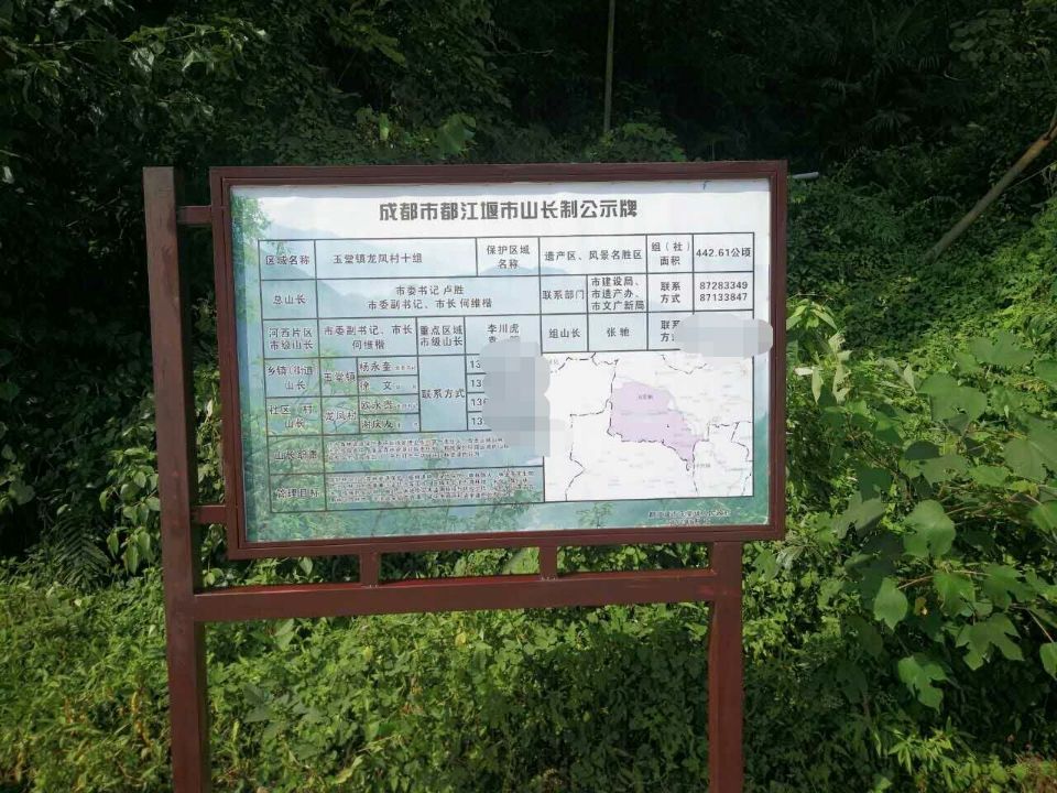 在都江堰山上的重要路段和重要位置都立有“山长制”公示牌,一方面明确山长职责,一方面也能让山长接受群众的监督。