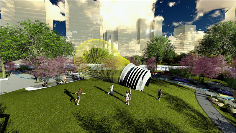 “现代高新乐活绿园,创意科技智慧生活”是张一帆团队方案的核心理念,他们将创新灵感具象化在灯泡雕塑中,并以高新建筑为主题设计剪影雕塑,还将“海绵城市”理念延伸到雨水花园的打造,在方案中展现出一个集生态、休闲、科技于一体的现代街头绿地,力求达到自然与城市、艺术创新与智慧生活的共融。