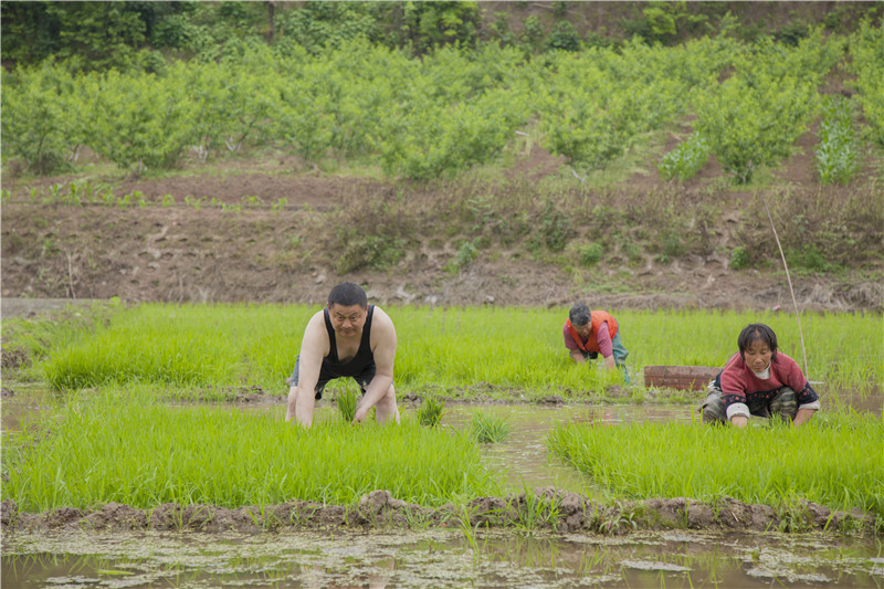 蒋乙嘉正在帮助农户插秧。(图片由遂宁市组织部提供)