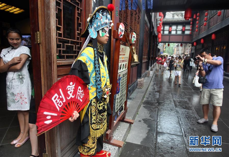 游客在四川省成都市锦里古街上拍摄一名川剧变脸扮相的模特(2011年7月16日摄)。锦里民俗休闲街是成都市一条以传统川西古镇为建筑风格的旅游休闲街区。古街上聚集了茶坊、客栈、酒吧、戏台、各种风味小吃、工艺品、土特产等诸多体验型商户。
