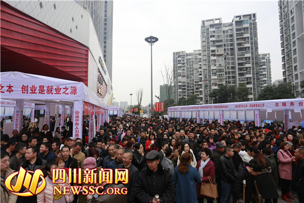 四川新闻网遂宁2月26日讯(记者 赵权军 摄影报道)新年伊始,万象更新。2月26日,2018年遂宁市“春风行动”暨就业扶贫大型招聘会举行,数千名求职者参加了春节后首个招聘会,此次招聘会吸引了成都、上海、绵阳,以及遂宁本地400余家企业提供的4万个岗位,且每份工作的待遇都不低于3000元钱。