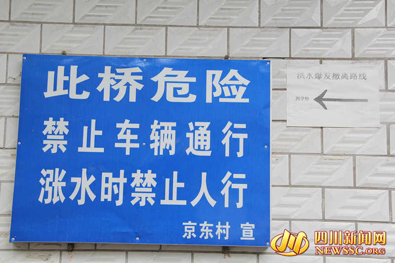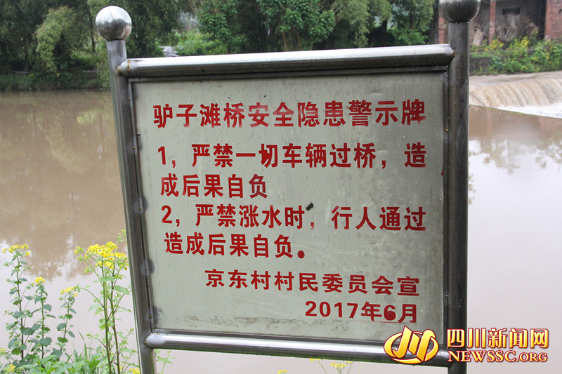 4月25日下午,四川新闻网记者驱车赶到现场,在京东村这边看见,通往芦溪河驴子滩桥的一条小路边,民房墙上贴着该村村委 “此桥危险 禁止车辆通行 涨水时禁止人形”的警示牌。来到河边,一座用石头砌起来的桥,也就是村民所称的“驴子滩桥”被洪水淹没,而且水流十分地急湍,记者看见整个桥是用石头砌起来的。