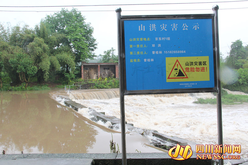在京东村这边的桥头上立着一个 “山洪灾害公示” 的警示牌,而牌子上写着“山洪灾害地点、第一责任人、第二责任人、监视员等内容以及‘山洪灾害区 危险勿进!’”落款却是前锋区观塘镇人民政府。在现场,记者看见两地不少村民脱掉鞋子、卷起裤子,小心翼翼地走过洪水淹没的桥面,让人看着心惊胆战。在岸边,记者还看见村民房屋上,还挂着一个监控摄像头,居然没有开。