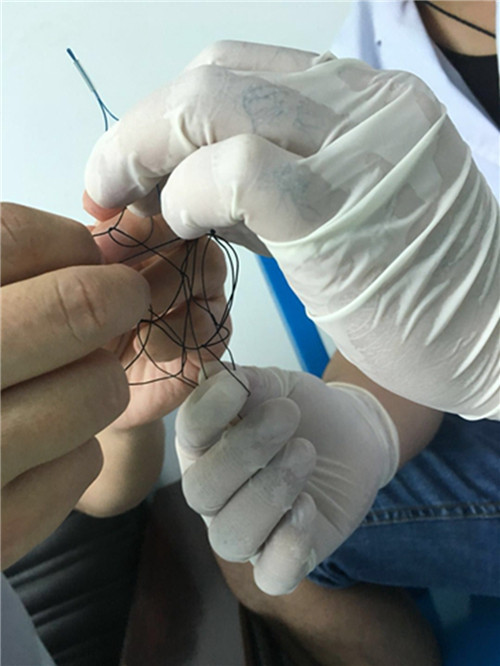 想来想去,樊林和科室人员决定用做息肉切除手术的线编制一张小网,然后安装在环形的结扎装置上。用这样一个网篮附件去罩住打火机一端的棱角处,然后在外面拉线,网篮就会缩小,以此固定住打火机。不过,在此过程中,还是出现了多次滑落以及打火机横着的情况。而樊林也一次次将打火机调整到合适的方向。