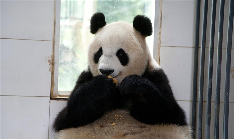大熊猫手捧月饼吃得津津有味。