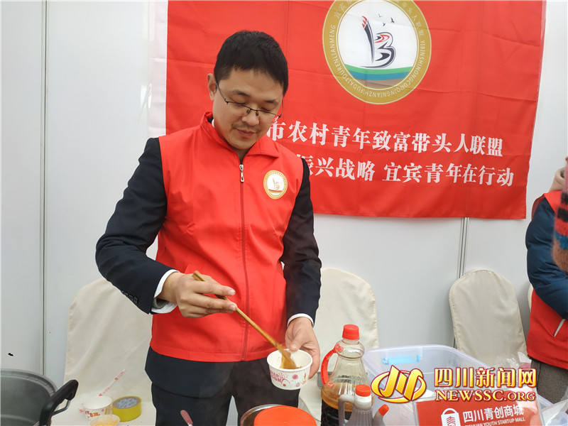 崔秀荣和胡志立两夫妻的展台前十分热闹,他们展示的产品是红薯粉条,现场烹制,加上各种调料,香气扑鼻,迅速吸引了过往游客。崔秀荣告诉四川新闻网记者,她和丈夫都是四川大学的毕业生,2008年两人毕业后就去了深圳工作。5年后的2013年,两人决定返乡创业。“老家在宜宾市高县复兴镇治安村,是一个贫困村,返乡创业也是为了可以为家乡脱贫出一份力。”