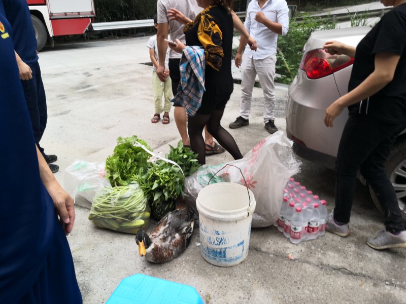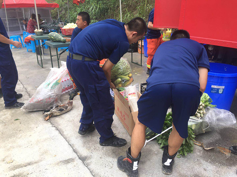 “消防员同志,你们辛苦了!”还没等消防队员反应过来,几个人便从车上下来,迅速打开轿车后备厢,并从后备箱里搬出了黄瓜、豇豆、空心菜、小白菜、玉米、南瓜等蔬菜以及土鸭子、生态鱼、粉条、鸡蛋、鸭蛋等一大批物资,一一堆放在了消防队员面前。他们感动地说,“这些天大家为我们灾区群众做了这么多,我们也没得啥子东西可以表达谢意的,这些菜都是自己种的,鸭子和鱼也是自家养的,希望你们能收下。”