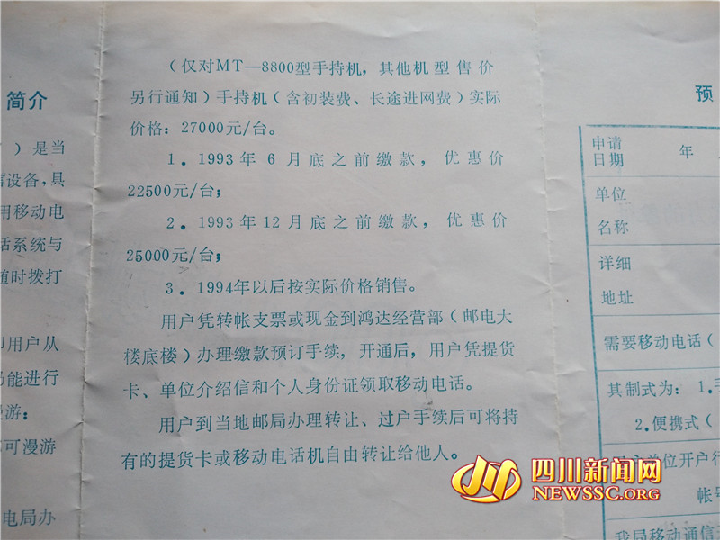 到了90年代初期,移动电话开始出现。看过早期香港影视片的人就知道,片中人物拿着的电话,叫做“大哥大”,颇像一块小砖头。那个时候,“大哥大”也开始进入德阳。到现在,何以清老人还收集着一张以前德阳市邮电局印制的广告单。一看价格竟然高达27000元。市民张世军说,当时德阳的房价大概是300元/平方米,一部电话相当于一套房子钱了。