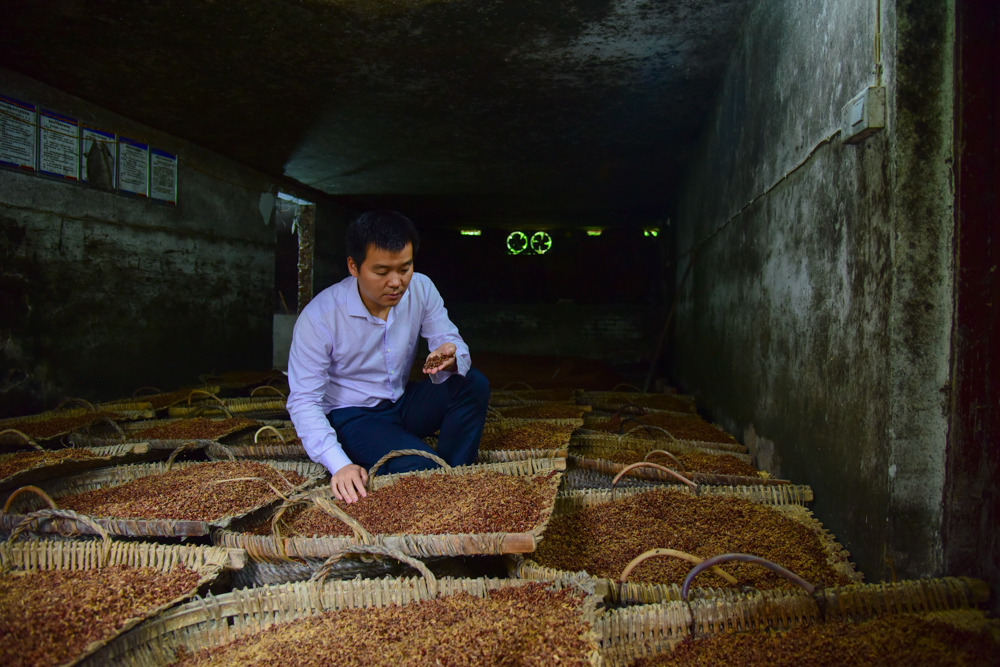 叙永县合乐苗族乡兴复村的酒坊中,驻村工作队队员梁晓彬正在查看刺梨酒的酿造情况
