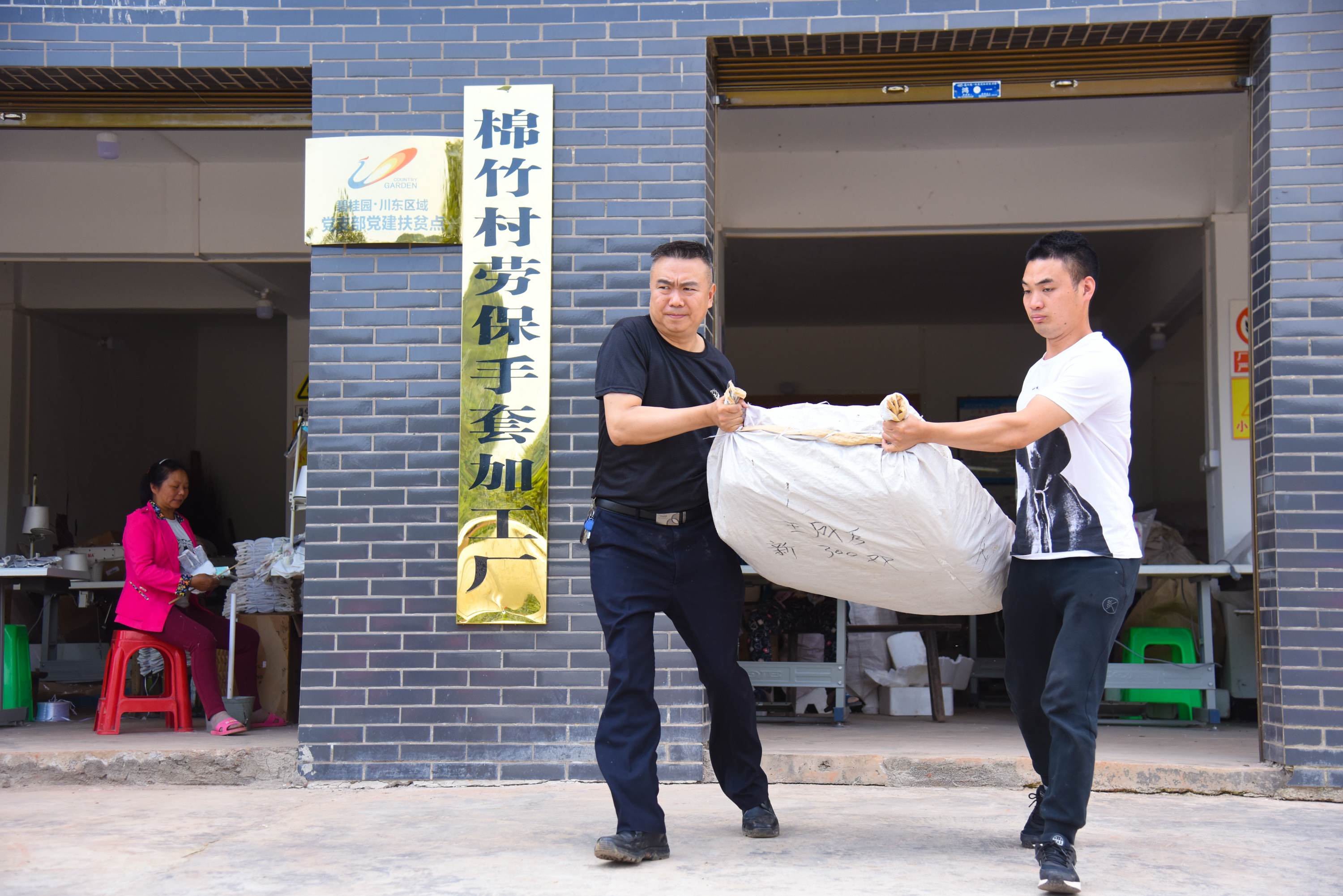 叙永县向林镇棉竹村的劳保手套加工党建扶贫车间,泸州市公安局派驻第一书记周亚(左)将手套成品搬送上车