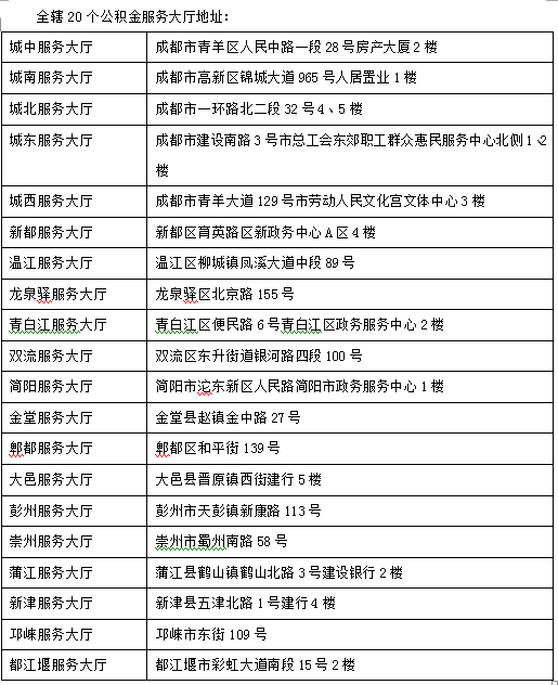 全辖20个公积金服务大厅地址(表据成都住房公积金管理中心)