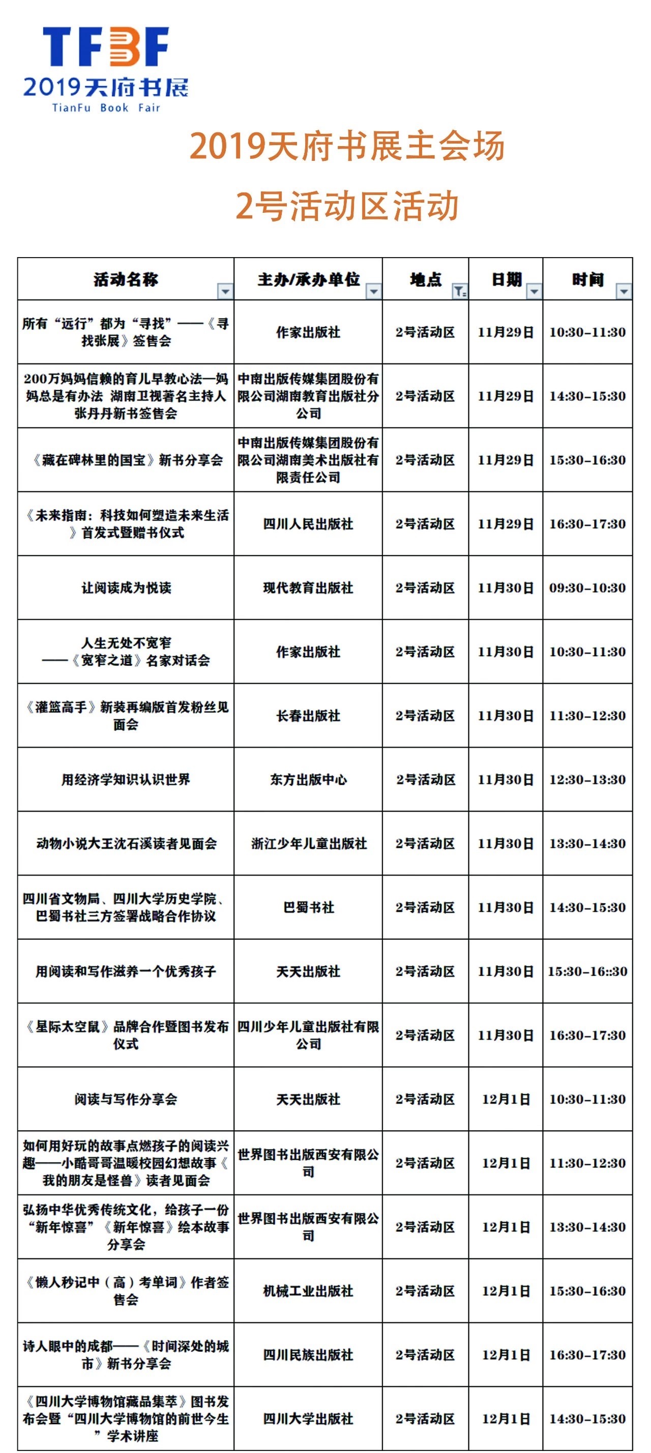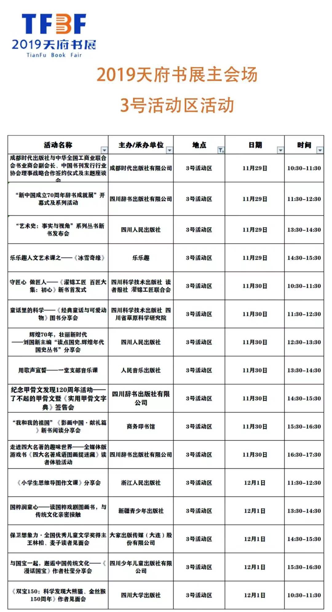 四川新闻网成都11月28日讯(记者 李慧颖)明天(11月29日),激动人心的时刻就要来啦!就在明天,中国中西部地区首个大型书展——2019天府书展将正式开展!全国29家出版集团、近300家单体出版社、17家民营图书策划单位、30余家非书文创企业齐聚于此,2.3万平方米的展馆,11万种图书,总有一款让你心动!如何逛展呢?四川新闻网记者奉上逛展攻略,收好啦!