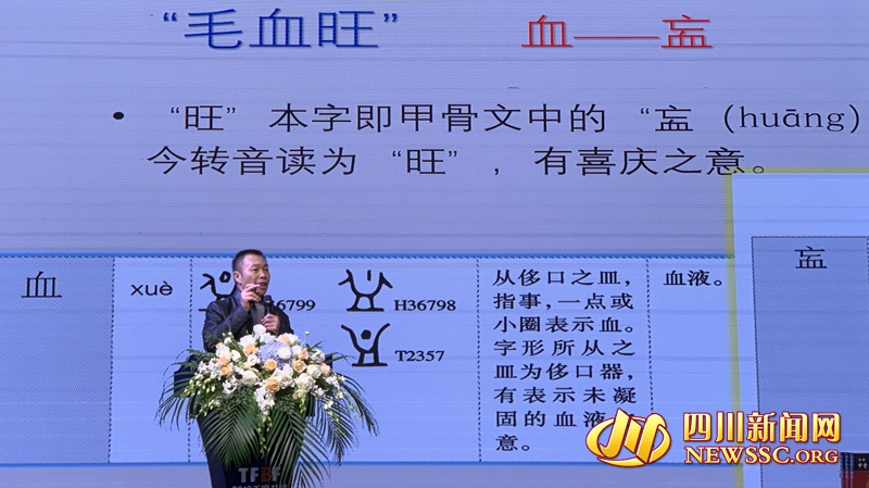 四川新闻网成都11月30日讯(记者 李慧颖 戴璐岭 摄影报道)120年前,一味叫龙骨的药材,让中国人找到了遗失的汉字童年。2019年11月1日,纪念甲骨文发现120周年座谈会在北京人民大会堂召开。2019年11月2日,四川大学古文字与先秦史研究中心挂牌成立。今日(11月30日),首届天府书展上,“纪念甲骨文发现120周年活动——了不起的甲骨文暨《实用甲骨文字典》签售会”举行,编著陈年福作为主讲人在现场为公众带来了有趣的甲骨文讲解。