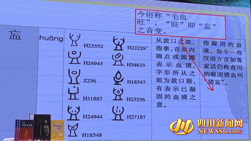 知道“毛血旺”的“旺”字用甲骨文怎么写吗?陈年福说到:“从敛口之皿,指事,在皿内画点或圆圈,表示血液。”“旺”字即甲骨文中的“衁(huāng)”,指凝固的血。现在转读音为“旺”,有喜庆之意。如今一些汉语方言如客家话仍称食用的凝固猪血为“猪衁”。