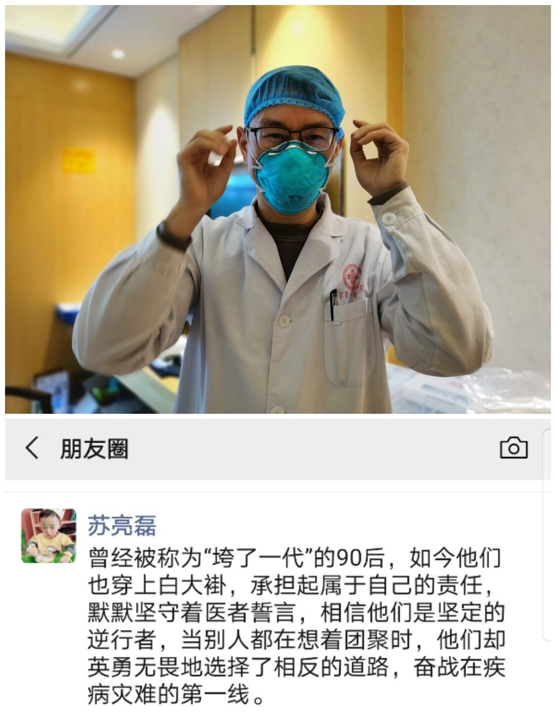 苏亮磊医生与他的爱人都在医院工作,自从疫情防控工作开始后,小两口都在防控一线,从未离开过工作岗位。家中的两个小孩也没来得及顾上。就像他朋友圈里说的样:曾经被称为“垮了一代”的90后,如今他们也穿上了白大褂,承担起属于自己的责任,默默坚守着医者誓言,相信他们是坚定的逆行者,当别人都在想着团聚时,他们却英勇无畏地选择了相反的道路,奋战在疾病灾难的第一线。