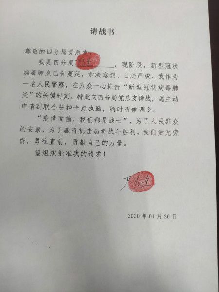 在请战书上,鲜红的手印格外醒目。它传递出了一名共产党员、一名人民警察对战胜这场疫情的坚定决心。“作为一名共产党员,必须第一时间站出来;作为一名人民警察,我们的职责和使命就是守护群众的生命安全。”尹彦奎说,“大家齐心协力,一定可以打赢这场硬仗。”