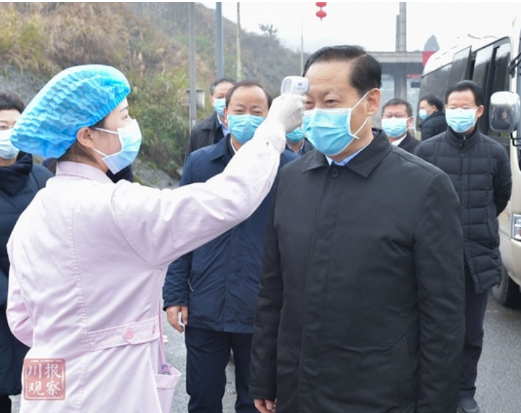 2月1日,省委书记彭清华到成自泸高速威远连界出口卫生防疫站,督导重要交通节点疫情防控举措落实情况,下车后主动配合医务人员进行体温检测。