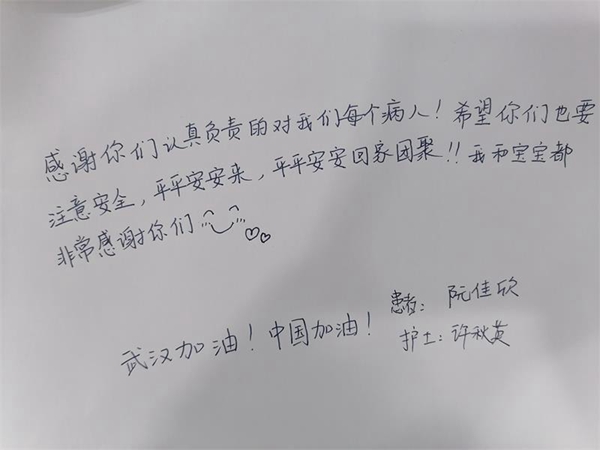 宜宾市第一人民医院的许秋英是四川第二批援鄂医疗队的成员,她管理的病人中有一位准妈妈,当得知许秋英是来自四川的救援队员之时,她非常感动,用一张小卡片写下了肺腑之言:“希望你们要注意安全、平平安安来,平平安安回家团聚!我和宝宝都非常感谢你们!”