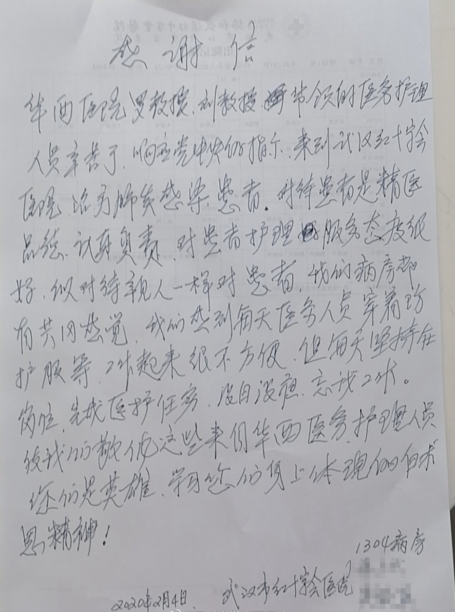 四川新闻网成都2月4日讯(记者 胡旭阳)2月4日,在武汉新冠病毒感染肺炎救治前线的华西医院第一批援鄂医疗队罗凤鸣医生和刘焱斌医生,收到了一封手写的感谢信,写这封信的是武汉市红十字会医院发热病房一位今天出院的患者,信中写到:“你们对待患者认真负责、对患者护理服务态度很好……我们敬佩来自华西的医务人员,你们是英雄!”
